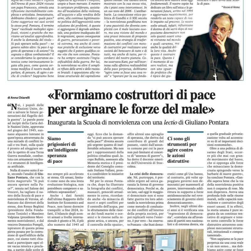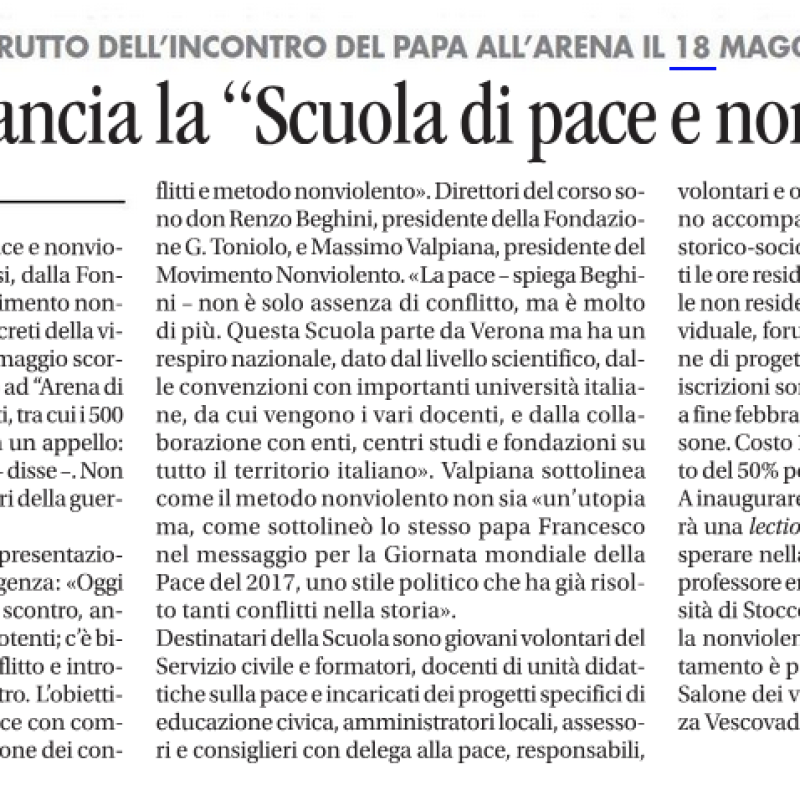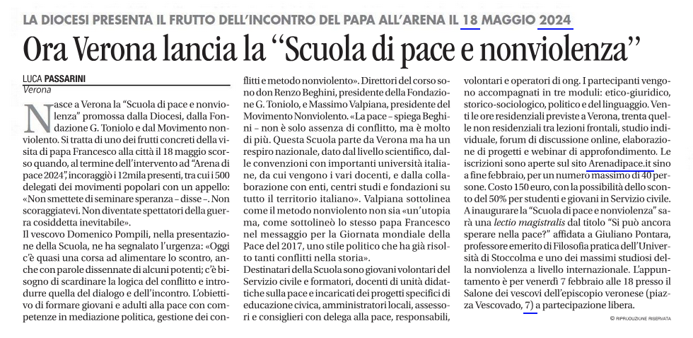 Sulla scia di Arena-2024, la Scuola di Pace e Nonviolenza, promossa dalla Diocesi di Verona, dalla Fondazione Toniolo e dal Movimento Nonviolento è una proposta inedita che ha l’obiettivo di formare giovani e adulti alla pace con competenze in mediazione politica, gestione dei conflitti e metodo nonviolento. Vuole fornire conoscenze, formare competenze e allenare prassi capaci di costruire fiducia, di negoziare riconciliazioni, di realizzare accettabili compromessi, di apprendere le tecniche della nonviolenza. Si rivolge in particolare a giovani Volontari del Servizio Civile e ai loro formatori; a Docenti di unità didattiche sulla pace e Incaricati dei progetti specifici di Educazione Civica; ad Amministratori locali, Assessori e Consiglieri con delega alla pace; a Responsabili, volontari e operatori di ONG.