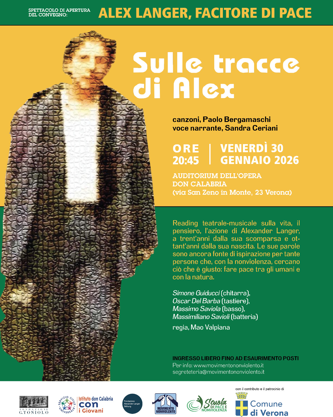 Il convegno sarà aperto la sera di venerdì 30 gennaio al Teatro del Don Calabria (a San Zeno in Monte) con il reading musicale (canzoni e parole) “Sulle tracce di Alex” con Paolo Bergamaschi e i suoi musicisti e i testi di Langer letti da Sandra Ceriani.