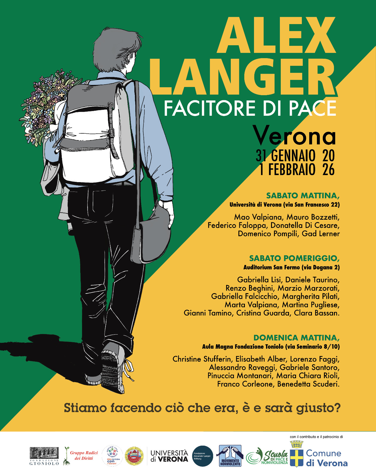 Il Convegno è promosso dalla Scuola di Pace e Nonviolenza (Fondazione Toniolo e Movimento Nonviolento), con il contributo e il patrocinio del Comune di Verona, Università di Verona, Diocesi di Verona, con l’adesione della Fondazione Alexander Langer Stiftung.