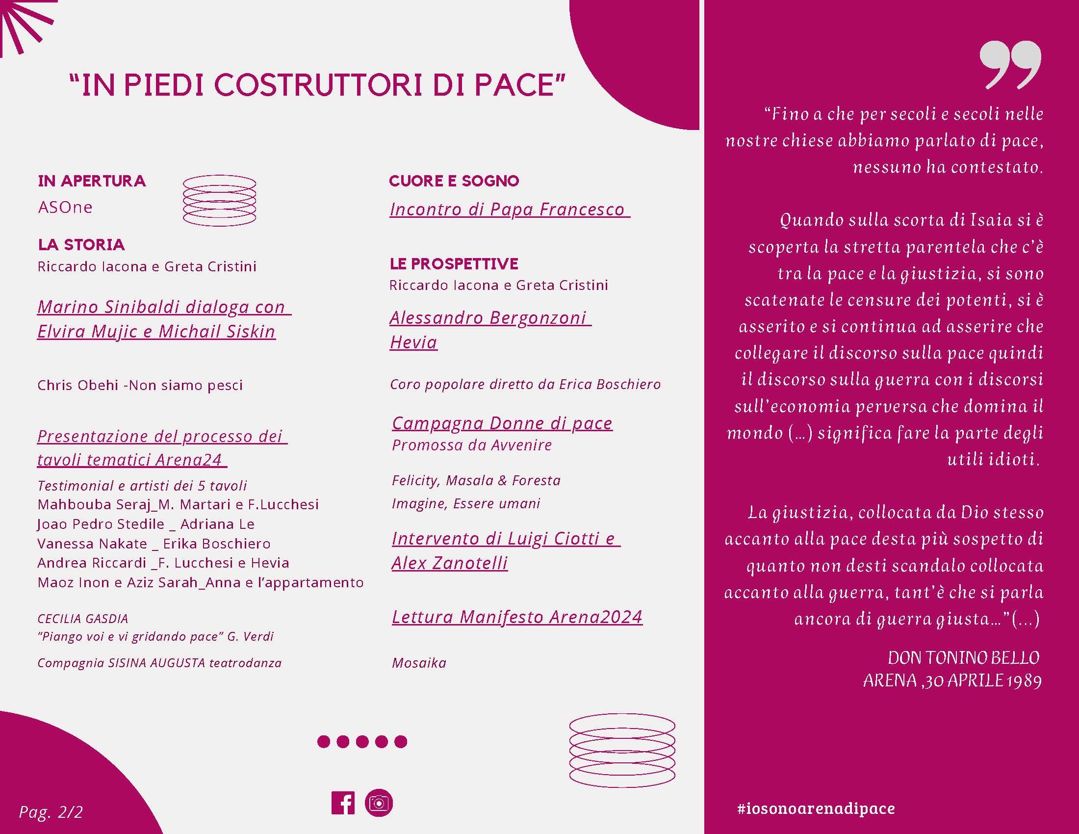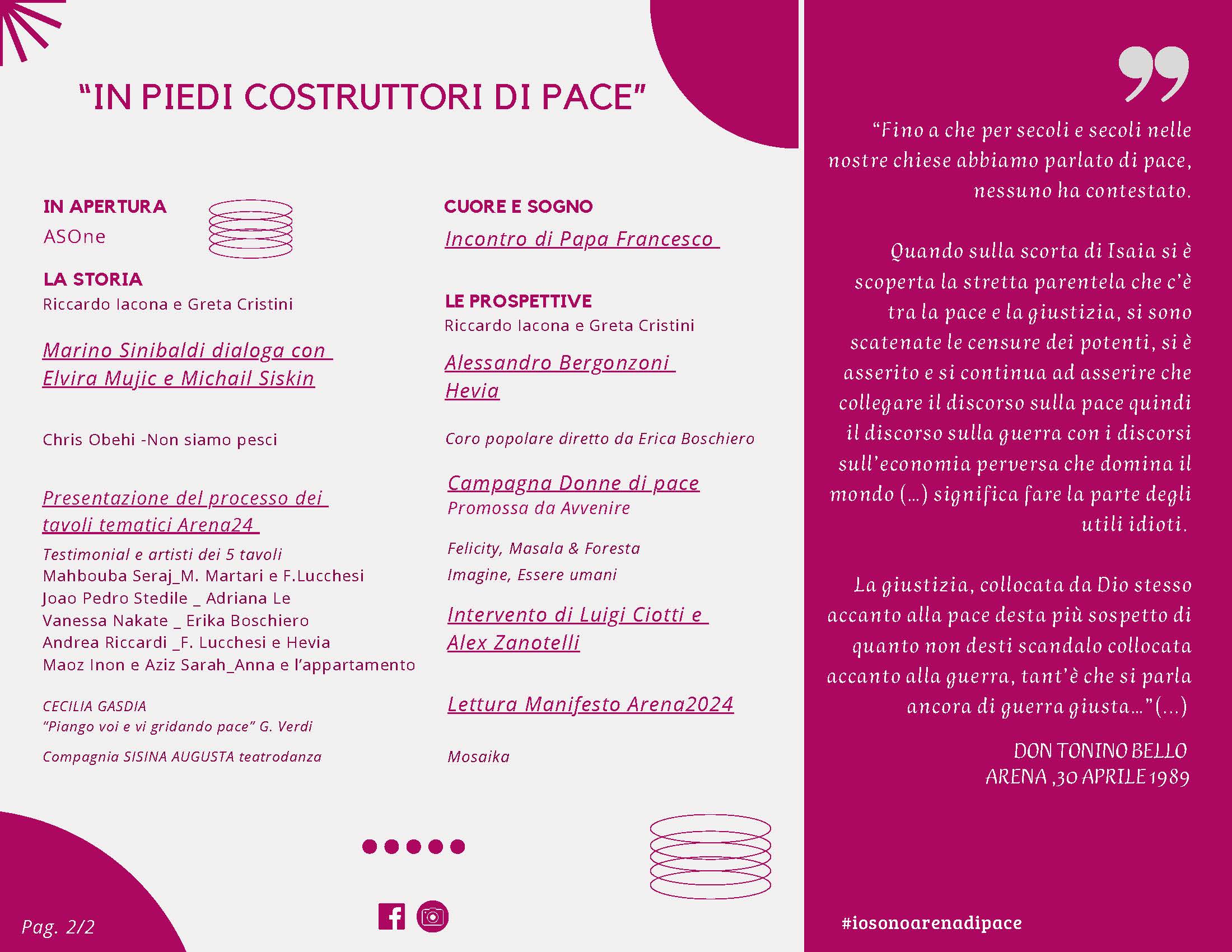 Arena di pace, che si svolgerà dalle 8.45 alle 12.30, è stata pensata non solo come grande momento assembleare dei movimenti popolari italiani, ma anche come occasione di incontro artistico-culturale, in cui la pace oltre ad essere proclamata è anche condivisa.