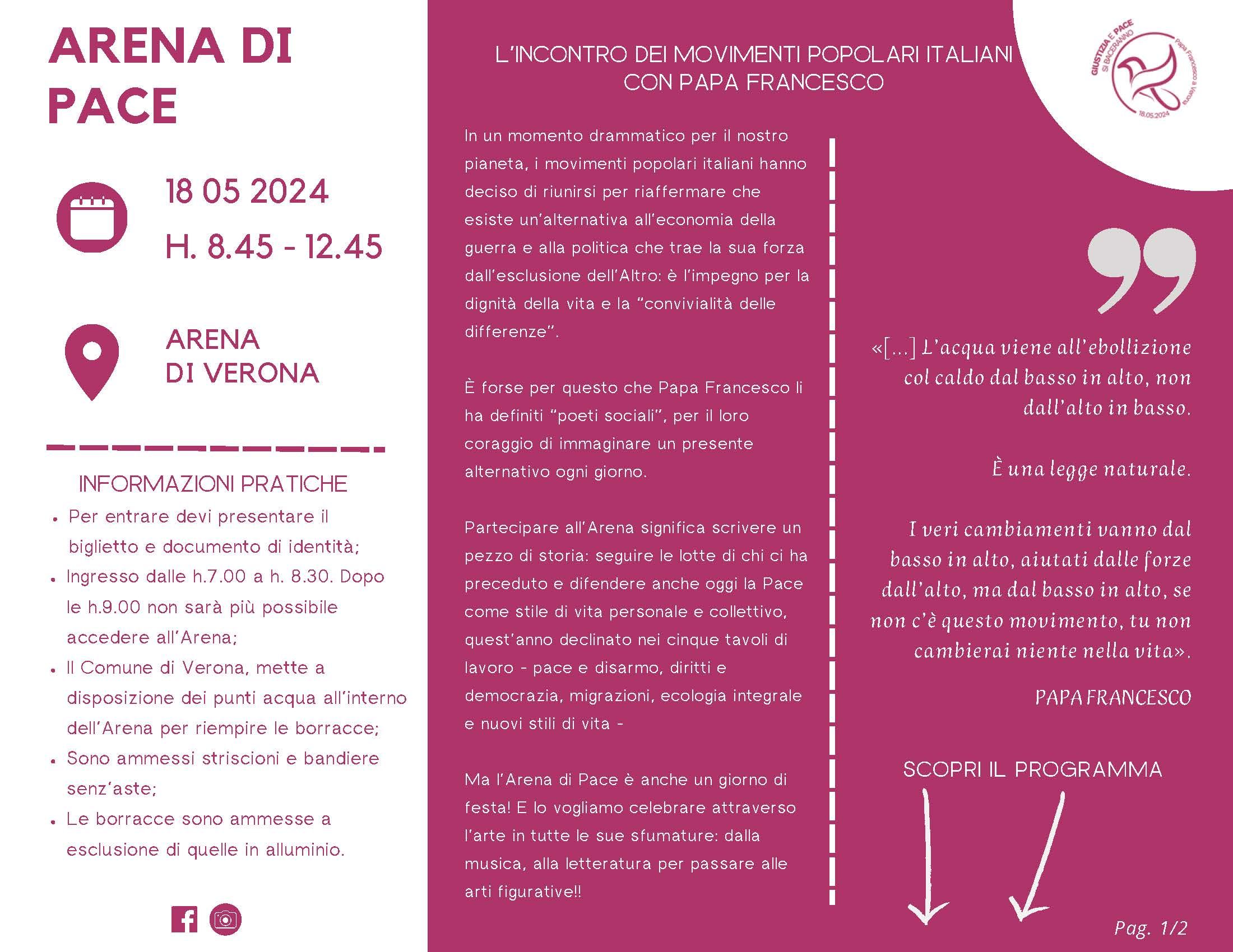 Sabato 18 maggio oltre diecimila persone saranno accolte nell’anfiteatro romano di Verona per “Arena di pace 2024”. E con loro vivrà un incontro speciale papa Francesco, in visita alla città e alla Chiesa scaligera.