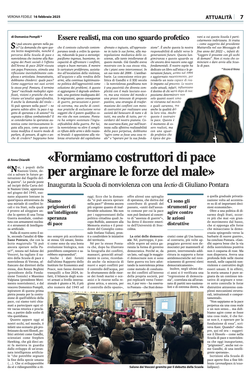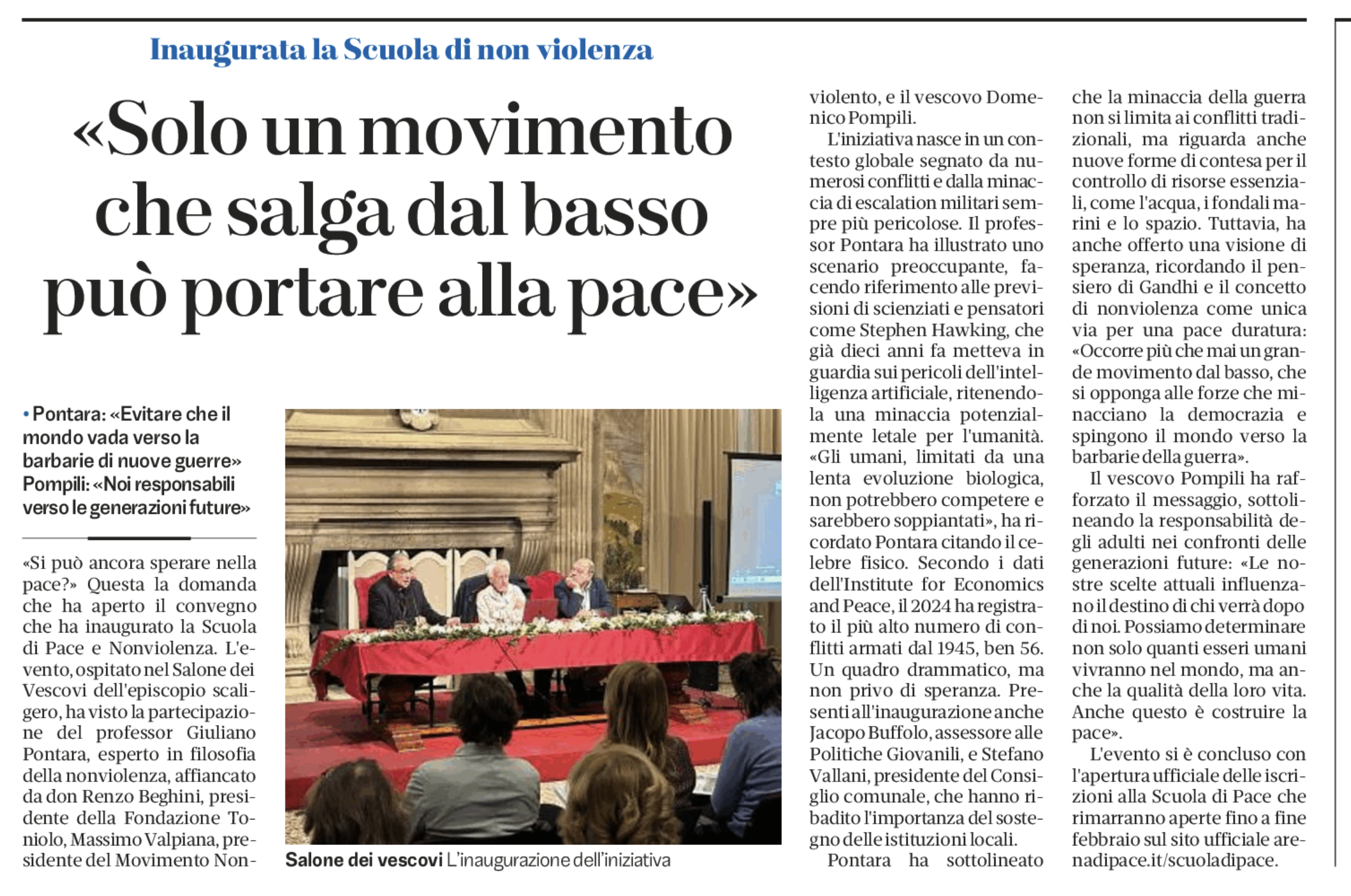 Sulla scia di Arena-2024, la Scuola di Pace e Nonviolenza, promossa dalla Diocesi di Verona, dalla Fondazione Toniolo e dal Movimento Nonviolento è una proposta inedita che ha l’obiettivo di formare giovani e adulti alla pace con competenze in mediazione politica, gestione dei conflitti e metodo nonviolento. Vuole fornire conoscenze, formare competenze e allenare prassi capaci di costruire fiducia, di negoziare riconciliazioni, di realizzare accettabili compromessi, di apprendere le tecniche della nonviolenza. Si rivolge in particolare a giovani Volontari del Servizio Civile e ai loro formatori; a Docenti di unità didattiche sulla pace e Incaricati dei progetti specifici di Educazione Civica; ad Amministratori locali, Assessori e Consiglieri con delega alla pace; a Responsabili, volontari e operatori di ONG.